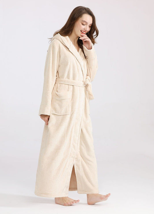 PUTUO Long Sleeves Ankle Length Fluffy Flannel Dressing Gown Bathrobe with Hood Sleep Wear Winter Wedding Robe